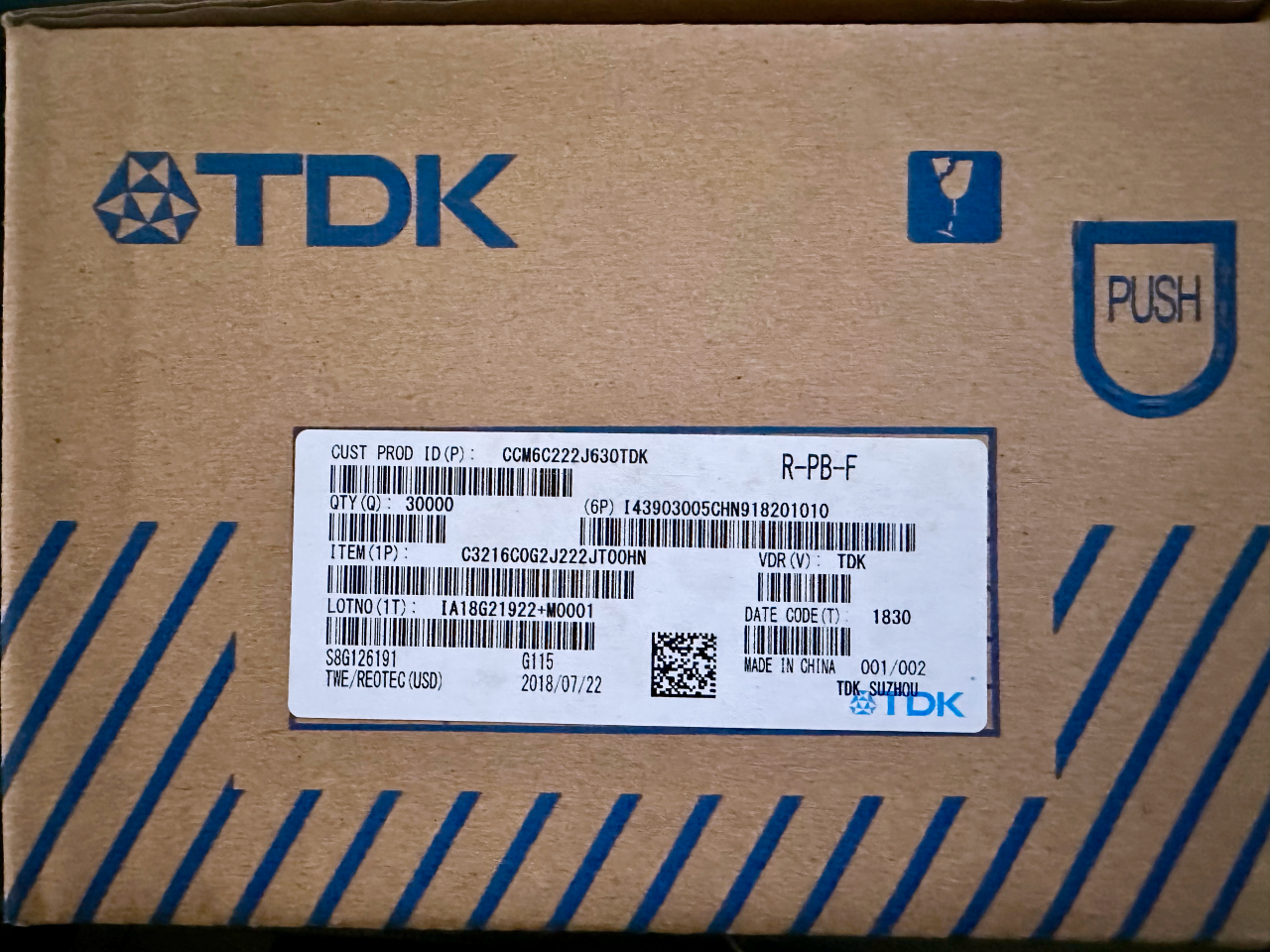 C3216C0G2J222JT00HN TDK MLCC Capacitor SMD 2200pF 630V C0G (NP0) 1206 (3216) ±5%