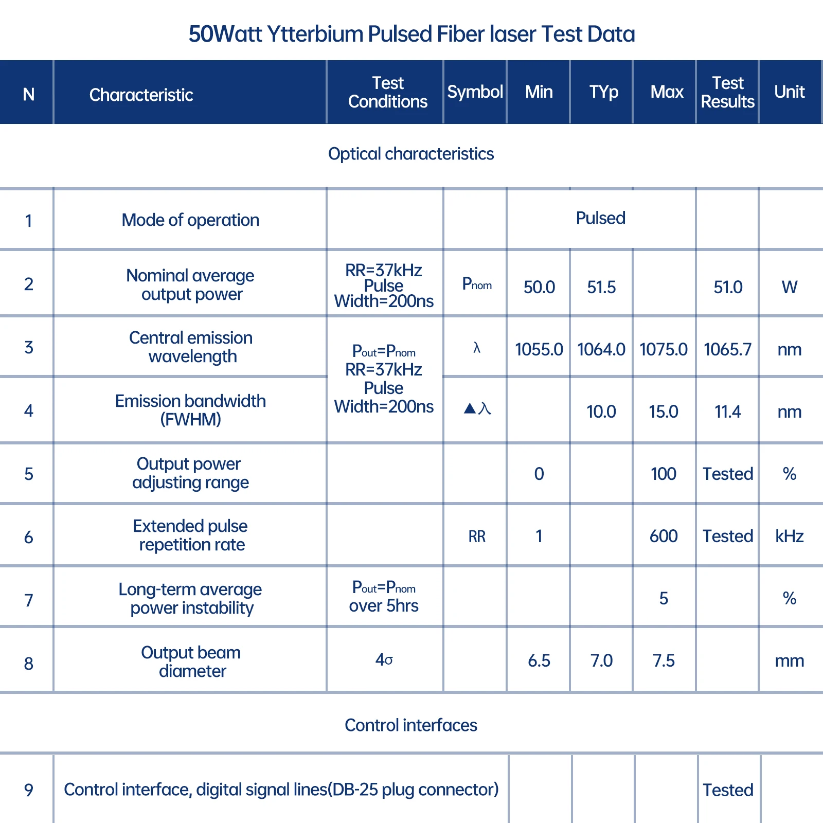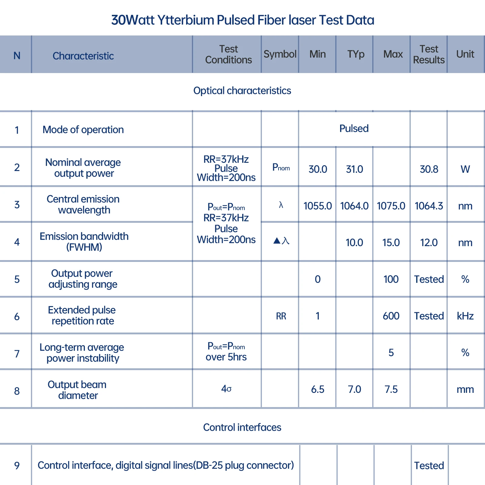 Frequency of pulse | RAYCUS/MAX is 20-100 KHz JPT LP is 1-600KHZ JPT M7 is 1-4000KHZ |