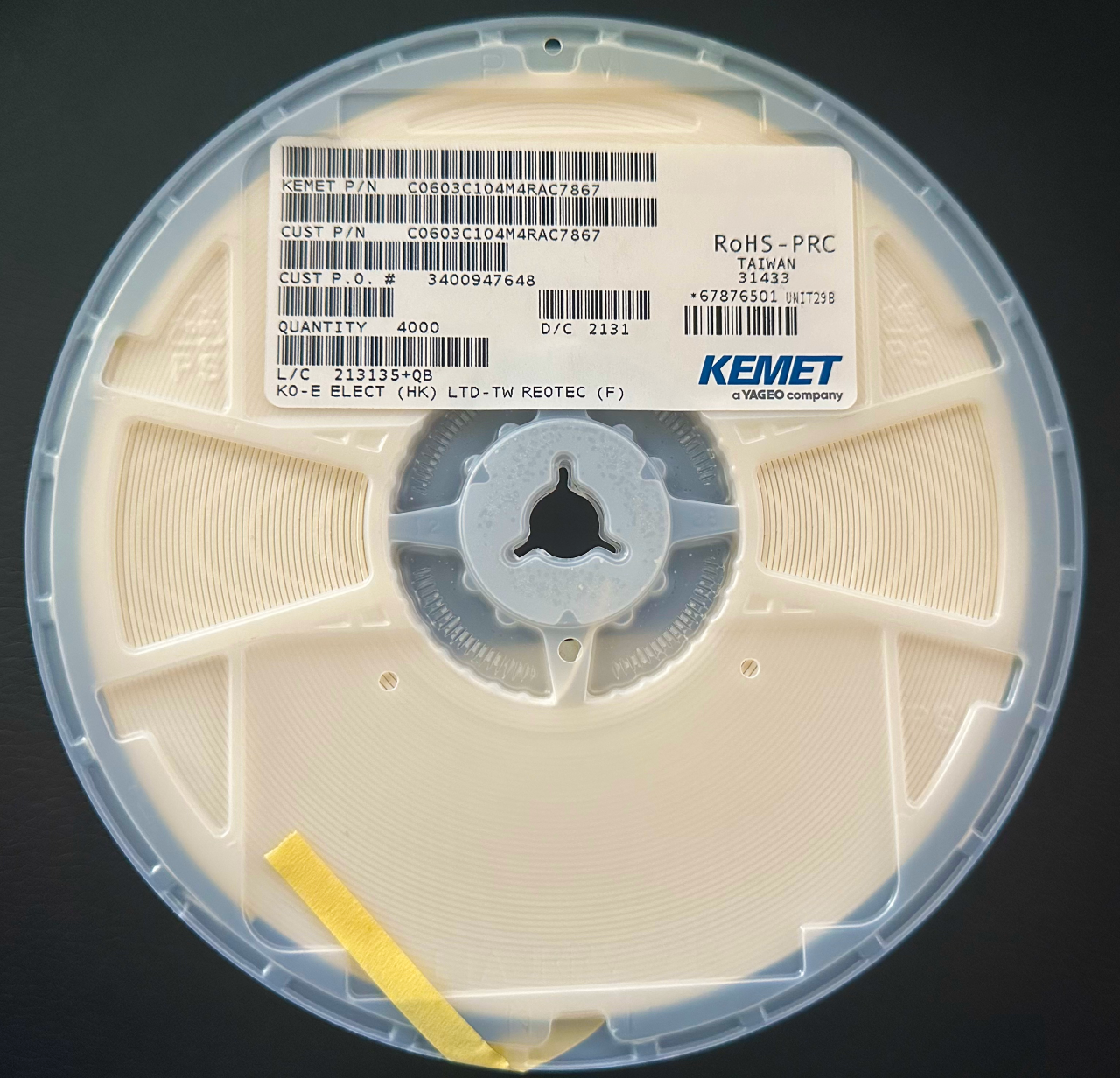 Full Reel of 4000 Pcs - C0603C104M4RAC7867 KEMET MLCC SMD 0.1uF 16V X7R 0603 20%