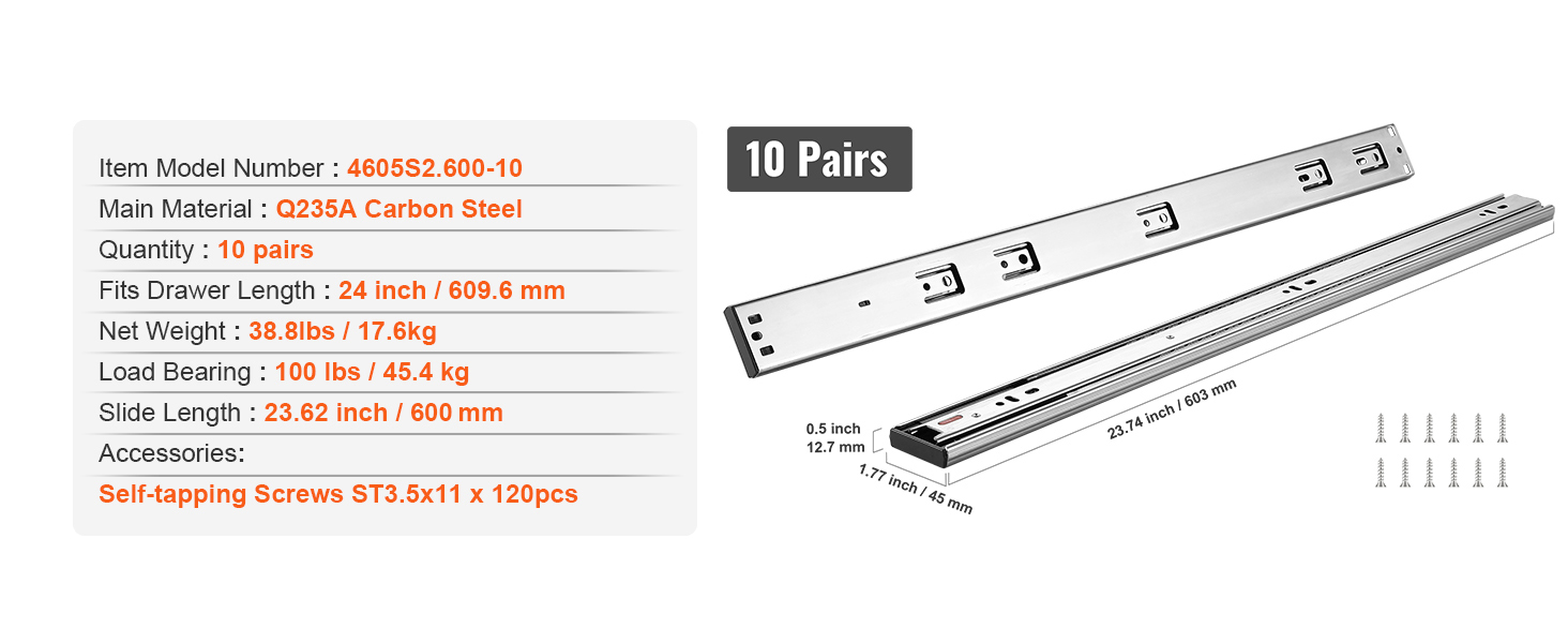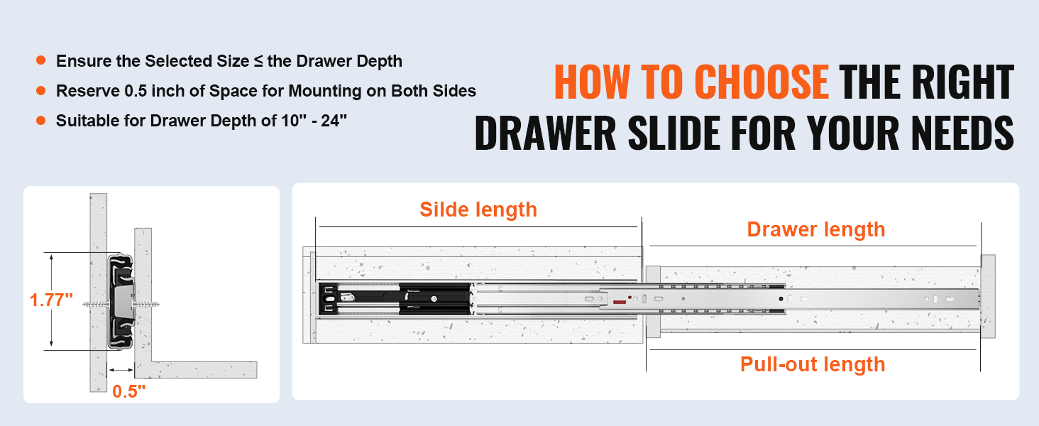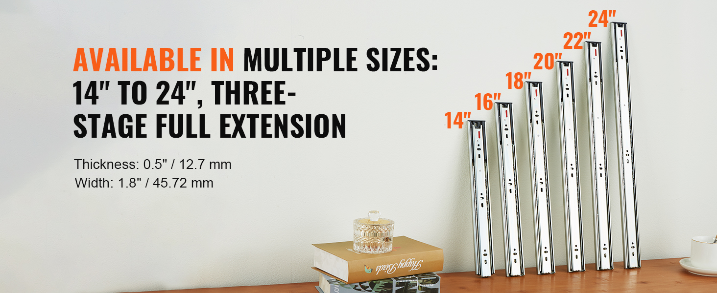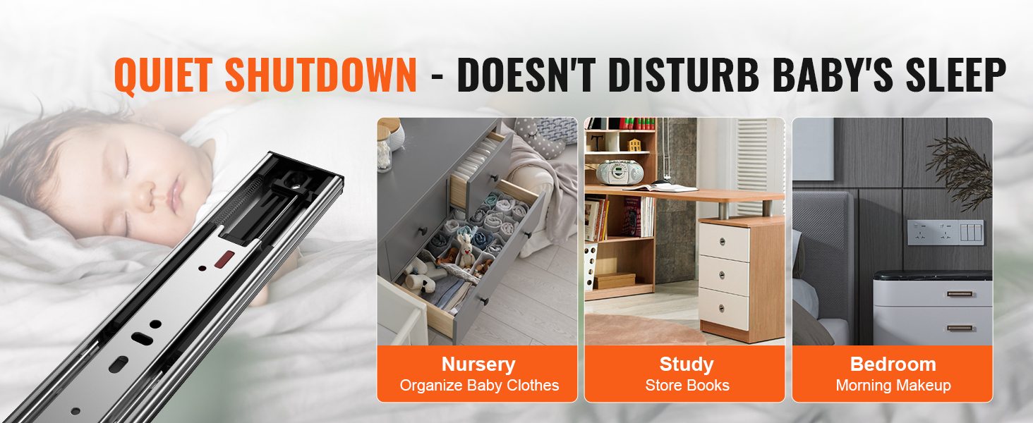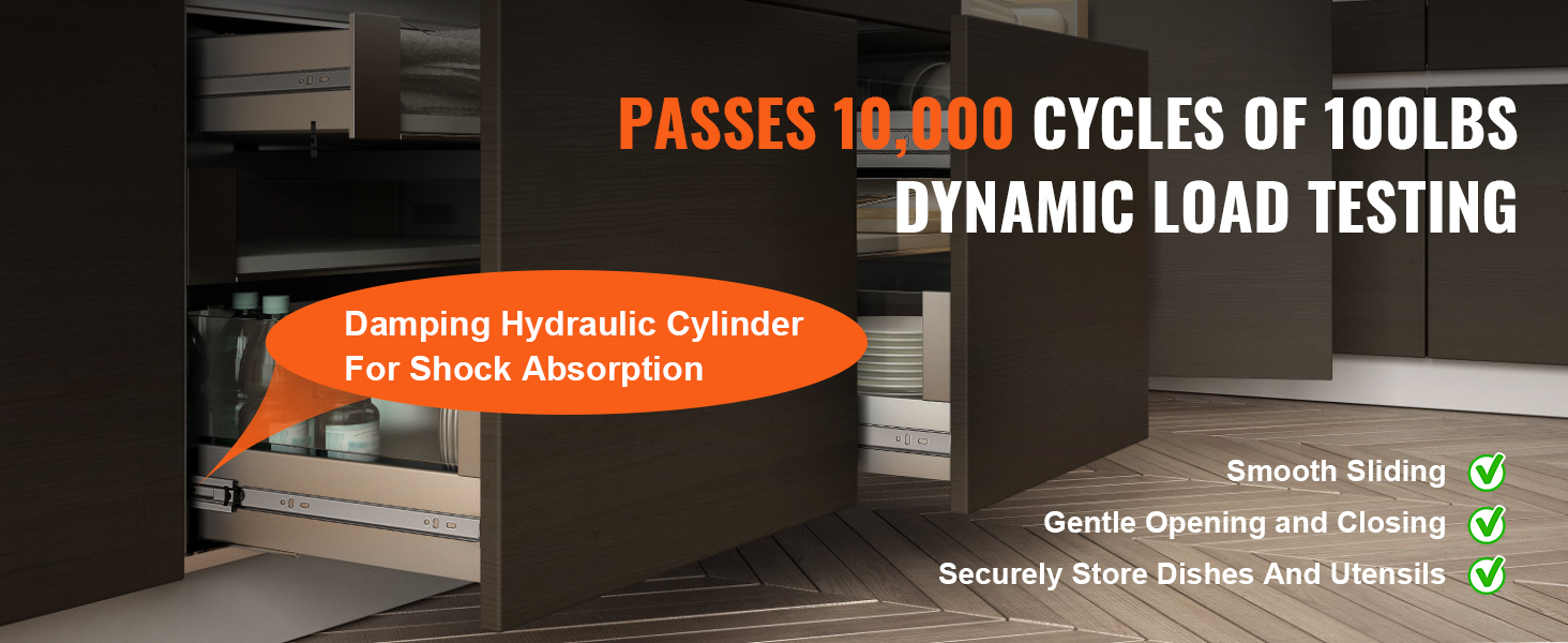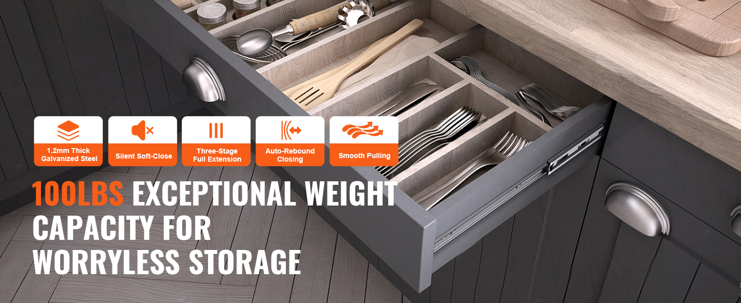 Our drawer slides offer a 100lbs weight capacity for reliable storage, equipped with galvanized steel, silent soft close, three-stage full extension, automatic rebound closure, smooth pulling, and the perfect combination of outstanding quality and ease of use.