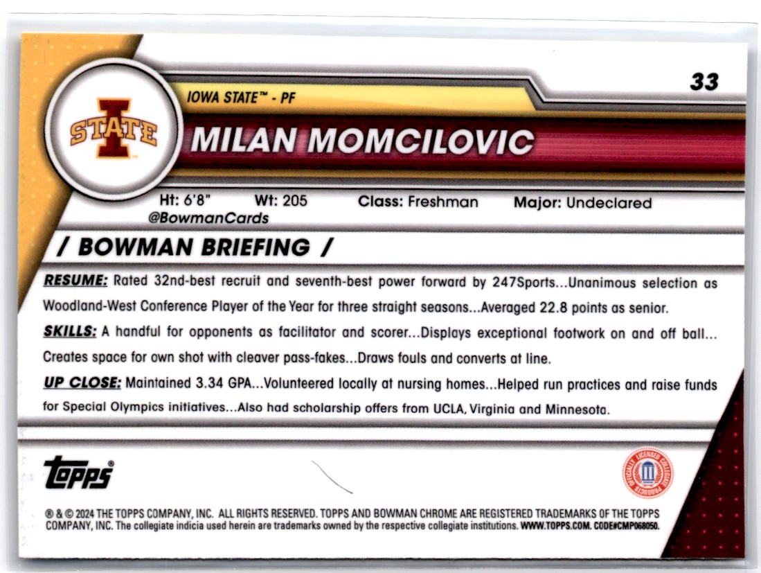 2023-24 Bowman Chrome U 1st Bowman Milan Momcilovic Iowa State Cyclones #33