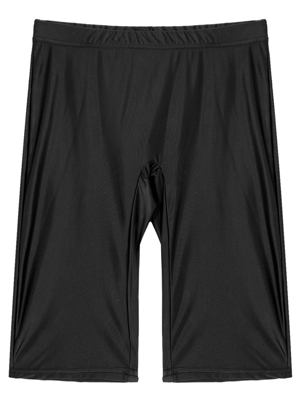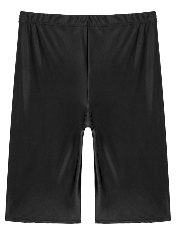 Glossy appearance, above knee length, with elastic waistband for comfy fit.