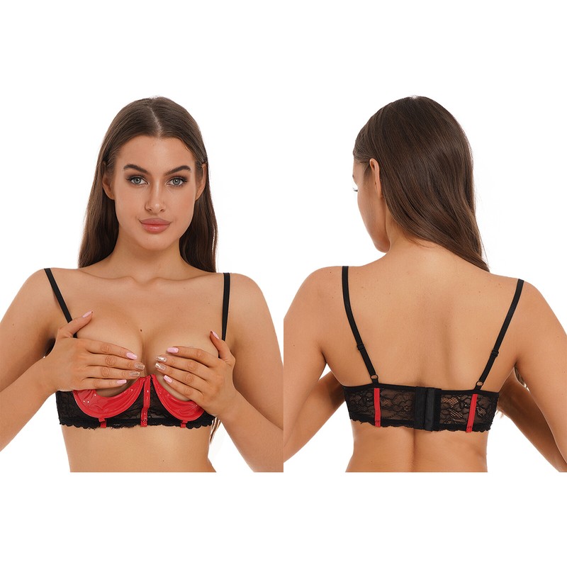 Women Strappy Open Cup Patent Leather Bowknot Underwired Bra Tops.