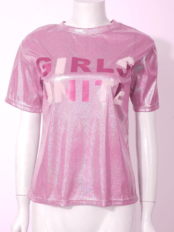 Womens Sparkling Round Neck Short Sleeve Tops Fashion Shiny Letter Printing T-shirt.