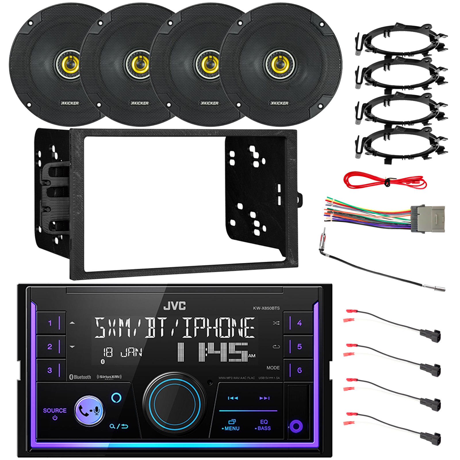 • PACKAGE BUNDLE INCLUDES: JVC KW-X850BTS Double DIN USB/AUX Bluetooth AM/FM Stereo Receiver, 4x Kicker CSC65 6.5" 300W Speakers w/Adapters, Radio + Speaker Harness, Antenna Adapter, Install Kit For Select 95-Up GM Vehicles