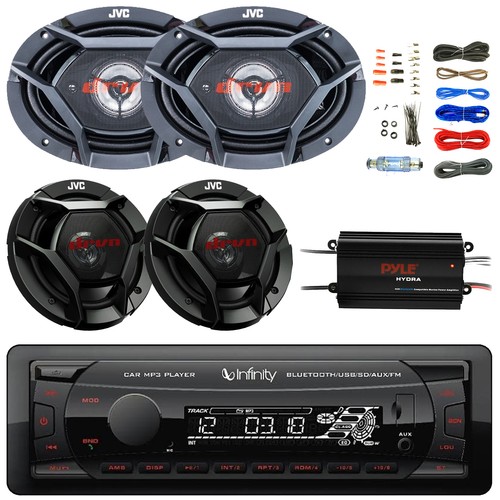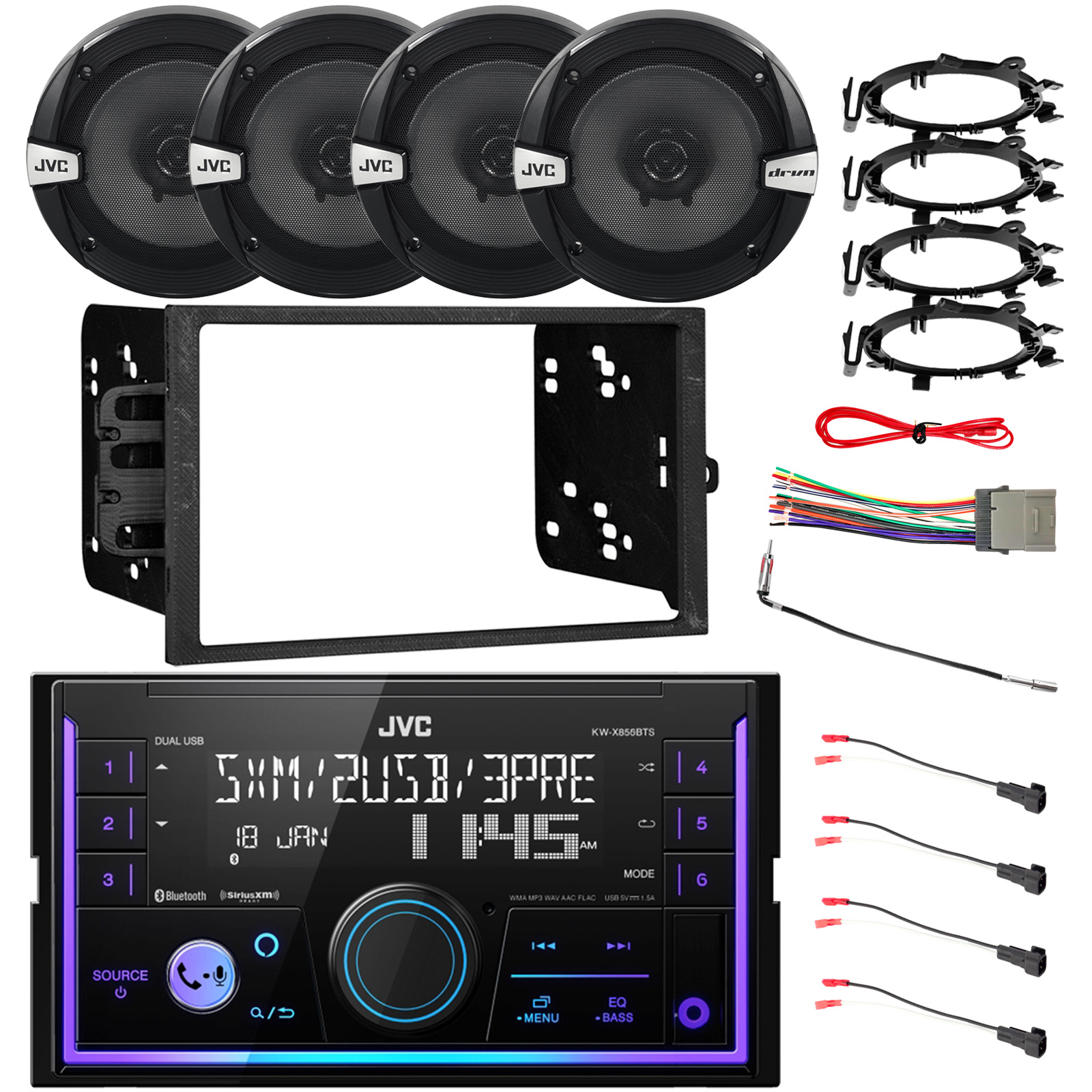 • PACKAGE BUNDLE INCLUDES: JVC KW-X855BTS Double DIN USB/AUX Bluetooth AM/FM Stereo Receiver, 4x JVC DR162 6.5" 300W Car Speakers w/Adapters, Radio + Speaker Harness, Antenna Adapter, Install Kit For Select 95-Up GM Vehicles