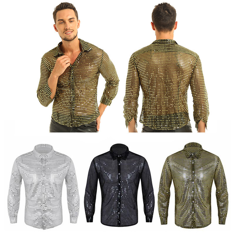 Men’s clubwear shirt tops, see through mesh with sequins design.