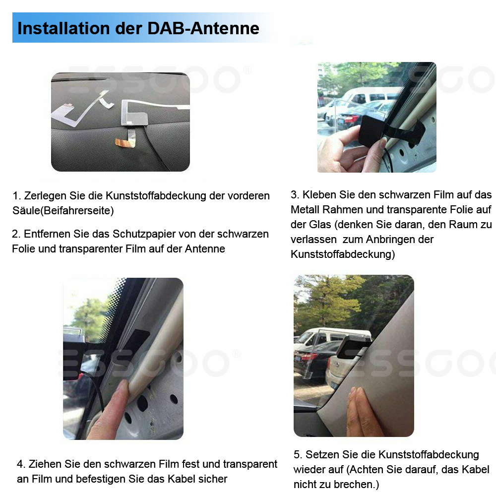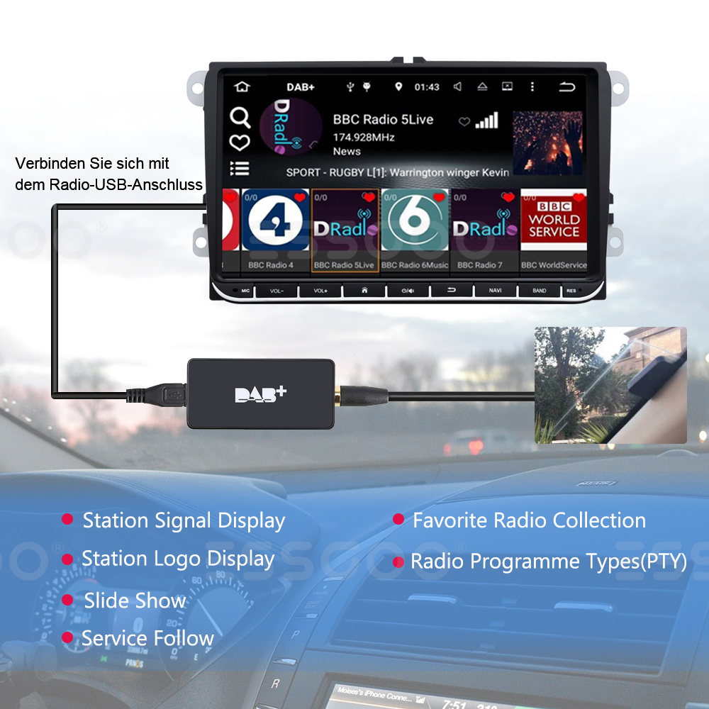 Verbinden Sie den USB-Stick mit dem USB-Anschluss der Android-Headunits und platzieren Sie die DAB + -Antenne in der optimalen Position Ihres Autos.