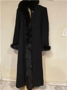 Elegant full length black 100% lambswool. The coat trim with 100% Authentic dyed fox fur along collar in tuxedo style from one side along the neck and cuffs as shown in the pictures. Back design with button attached belt.