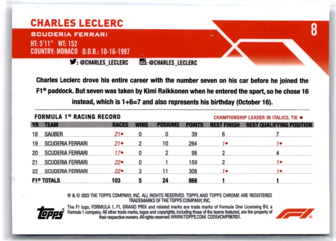 2023-24 Topps Chrome Formula 1 Charles LeClerc Scuderia Ferrari #8