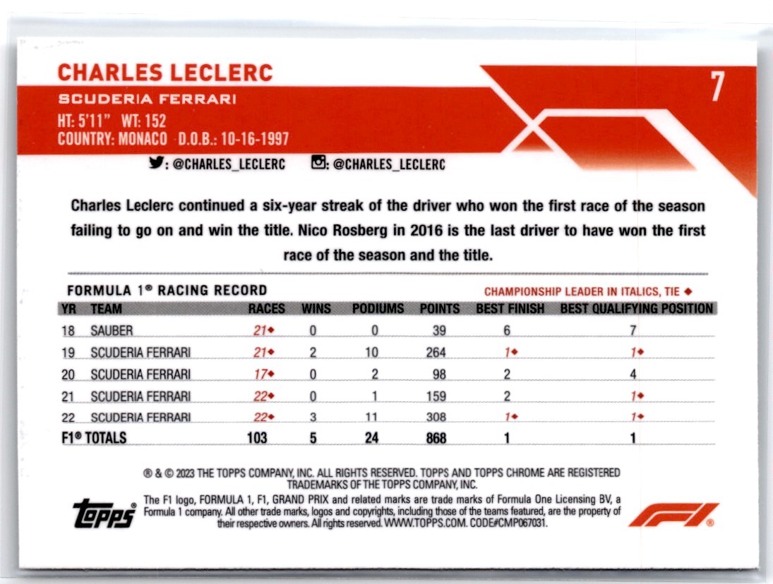 2023-24 Topps Chrome Formula 1 Charles LeClerc Scuderia Ferrari #7