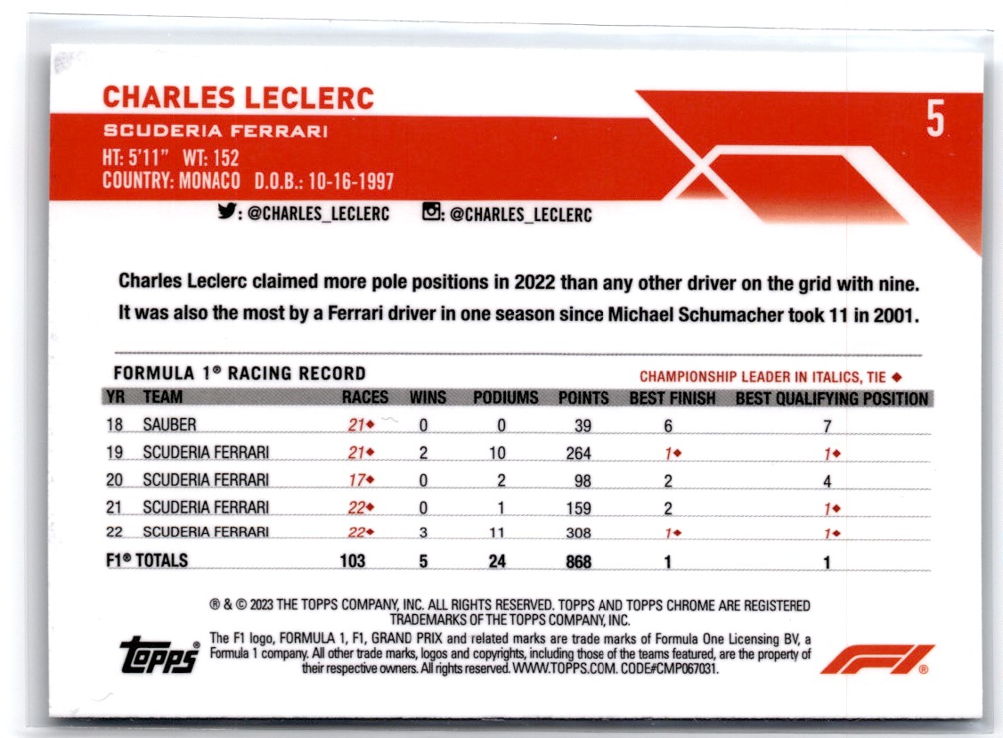 2023-24 Topps Chrome Formula 1 Charles LeClerc Scuderia Ferrari #5