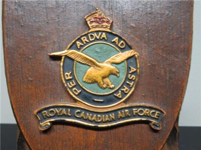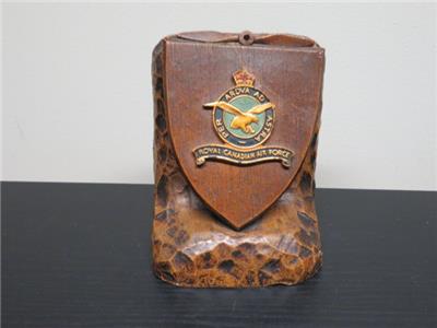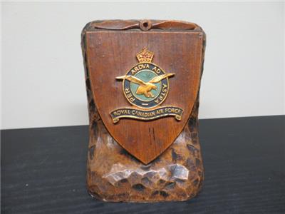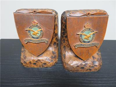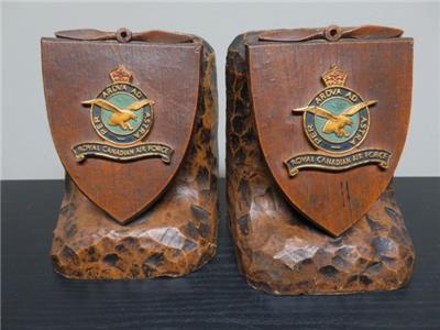 Nice pair of mid-century or earlier genuine "Durwood" bookends to the Royal Canadian Air Force. The Durwood product is a heavy cast composite resin and wood fibre which appears to look like real wood. Includes the original foil sticker on back of 1 bookend "Genuine Durwood made in Canada by John Walter & Son Limited Kitchener Ontario."