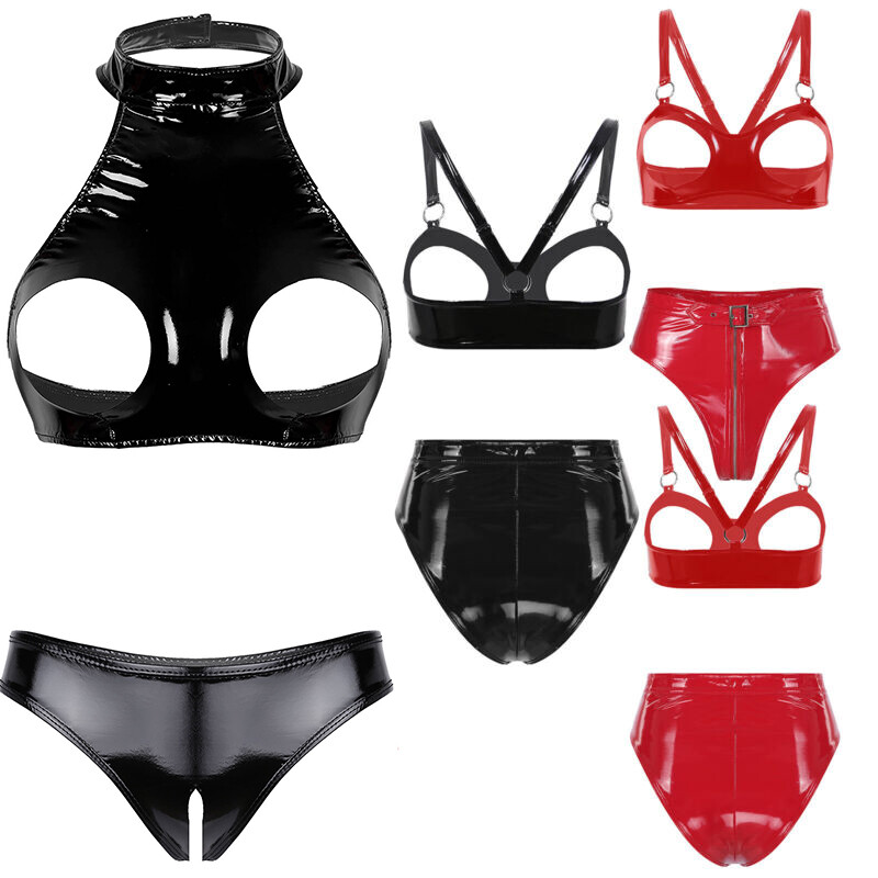 Women Glossy Patent Leather Underwired Bra Adjustable Straps Unlined Brassiere.