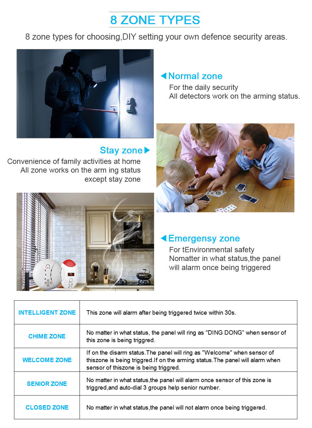 8. Support many defense zones, such as gate, SOS, bedroom, window, balcony, perimeter, smoke, gas, carbon monoxide, water leaking, etc.