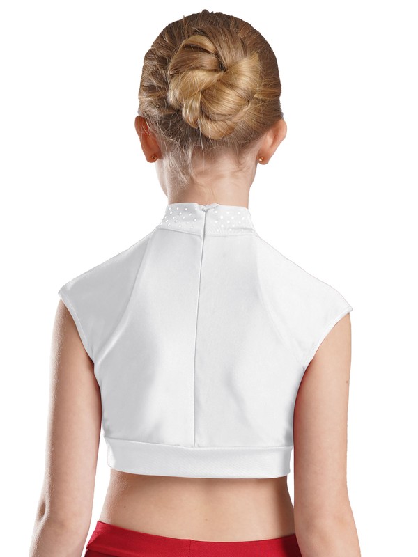 Girl’s top is decorated with shiny rhinestones to brighten up any performance and create an eye-catching effect.