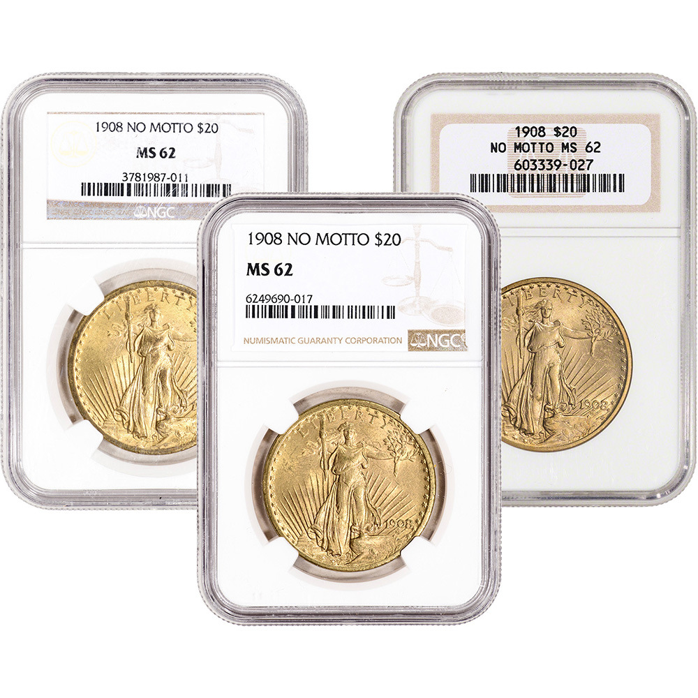 US Gold $20 Saint-Gaudens Double Eagle - 1908 No Motto - Random Label