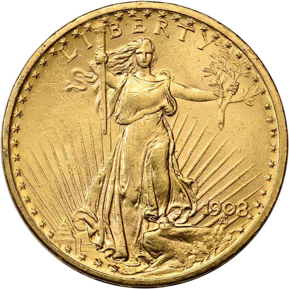 US Gold $20 Saint-Gaudens Double Eagle is considered by many to be the most beautiful US coin ever made. They were minted from 1907 - 1933 and survived the Gold Reserve Act of 1934 which outlawed private ownership of gold in the United States. The "No Motto" Saint Gaudens were only minted in 1907 and 1908 making them more difficult to obtain.