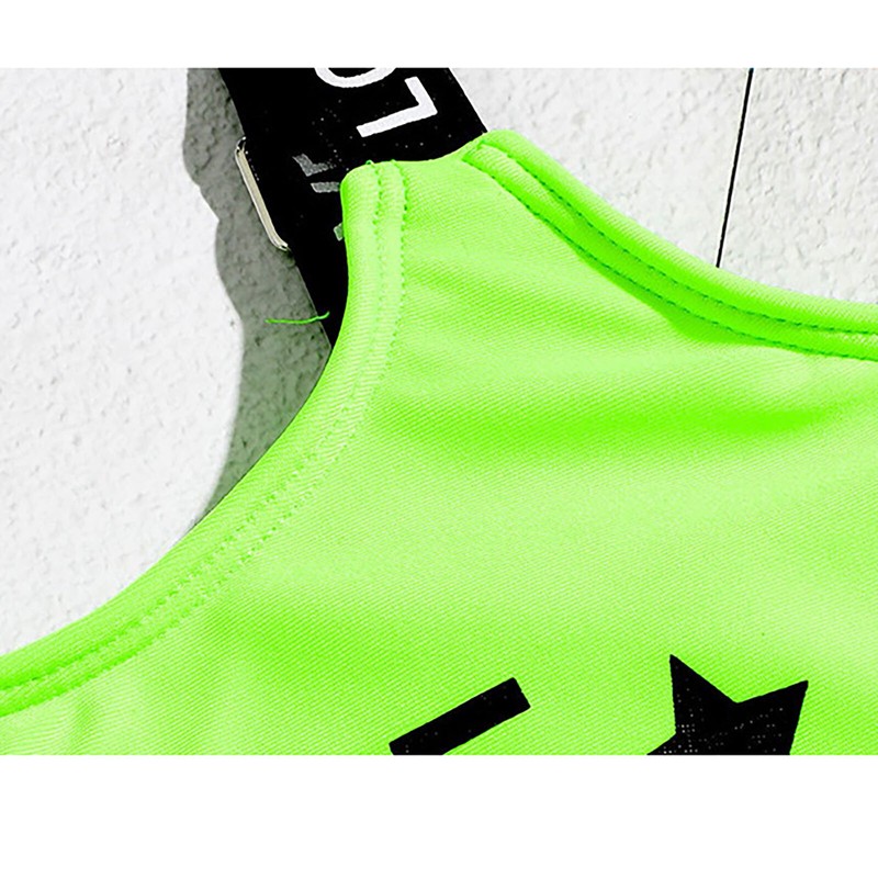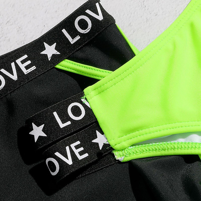 Bright color contrast design with stars, letters print at straps and waistbands make girls more fashionable.