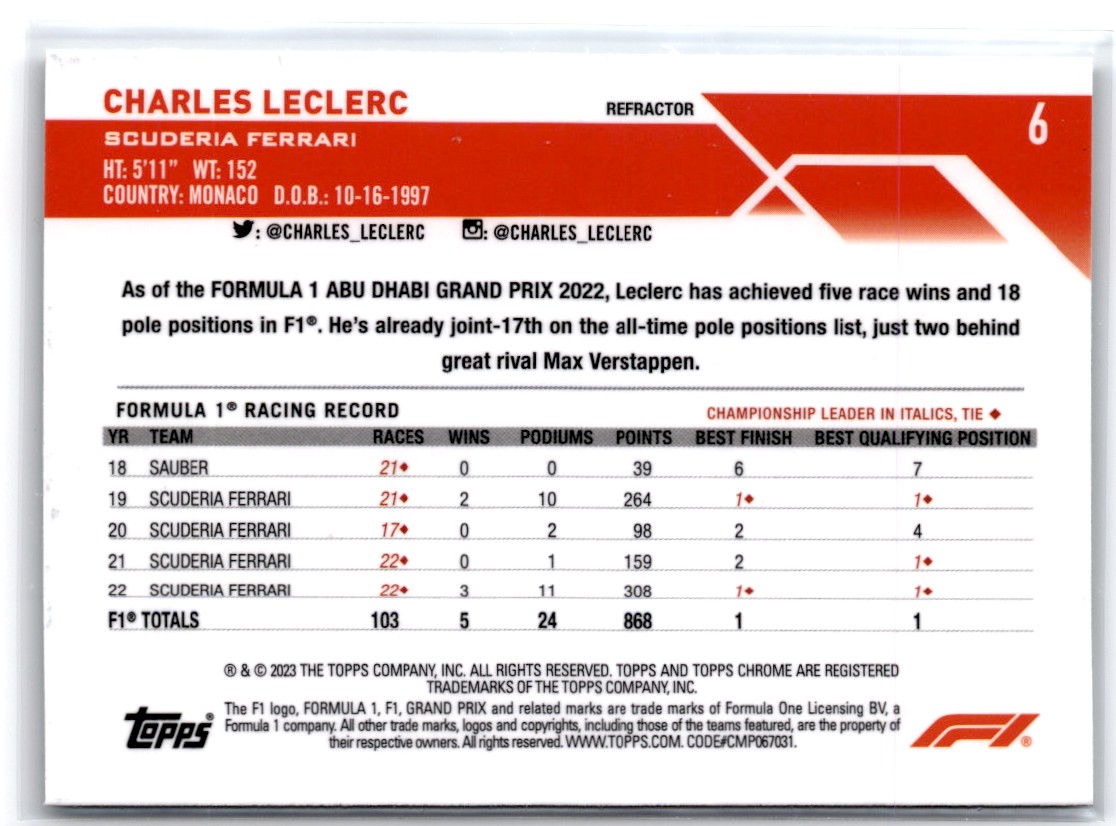 2023-24 Topps Chrome Formula 1 Refractor Charles LeClerc Ferrari #6