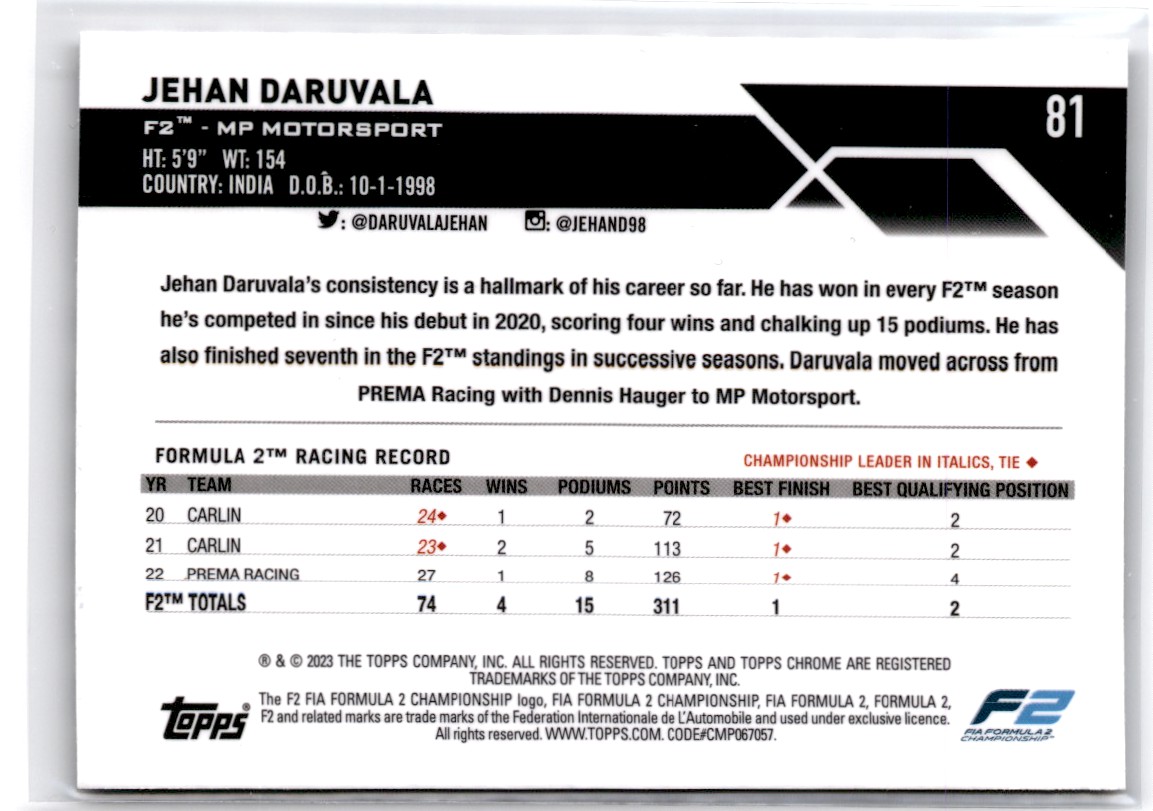 2023-24 Topps Chrome Formula 1 Purple Checkered Flag Jehan Daruvala /199 MP