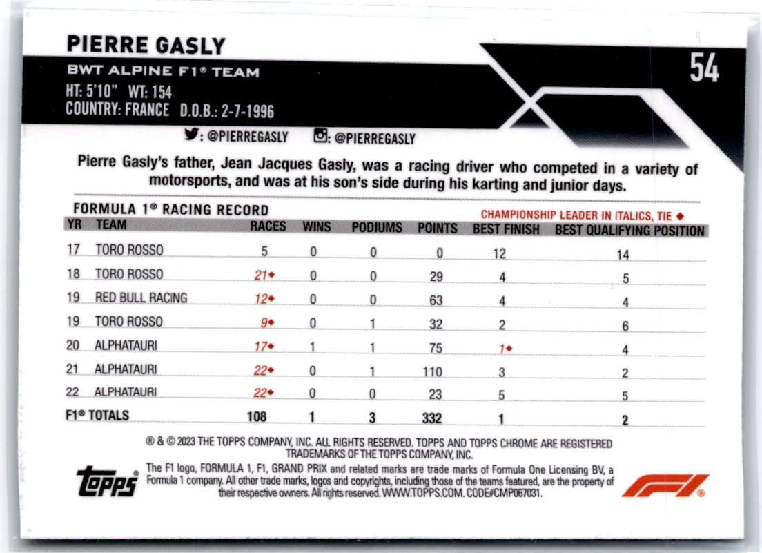 2023-24 Topps Chrome F1 Sapphire Pierre Gasly Alpine #54