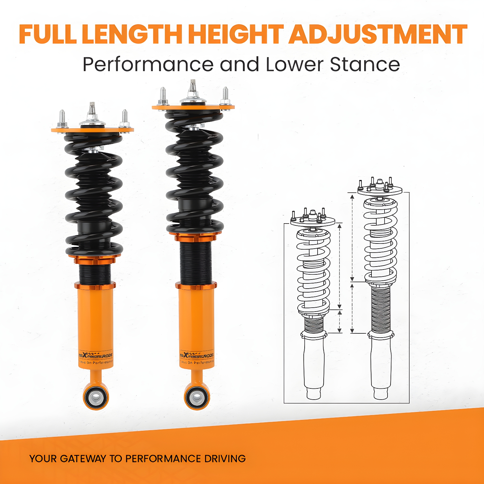 1. Lowered height adjustment from 1" - 3" (depends on vehicle models) which allows a lower center of gravity and also adds a more aggressive stance