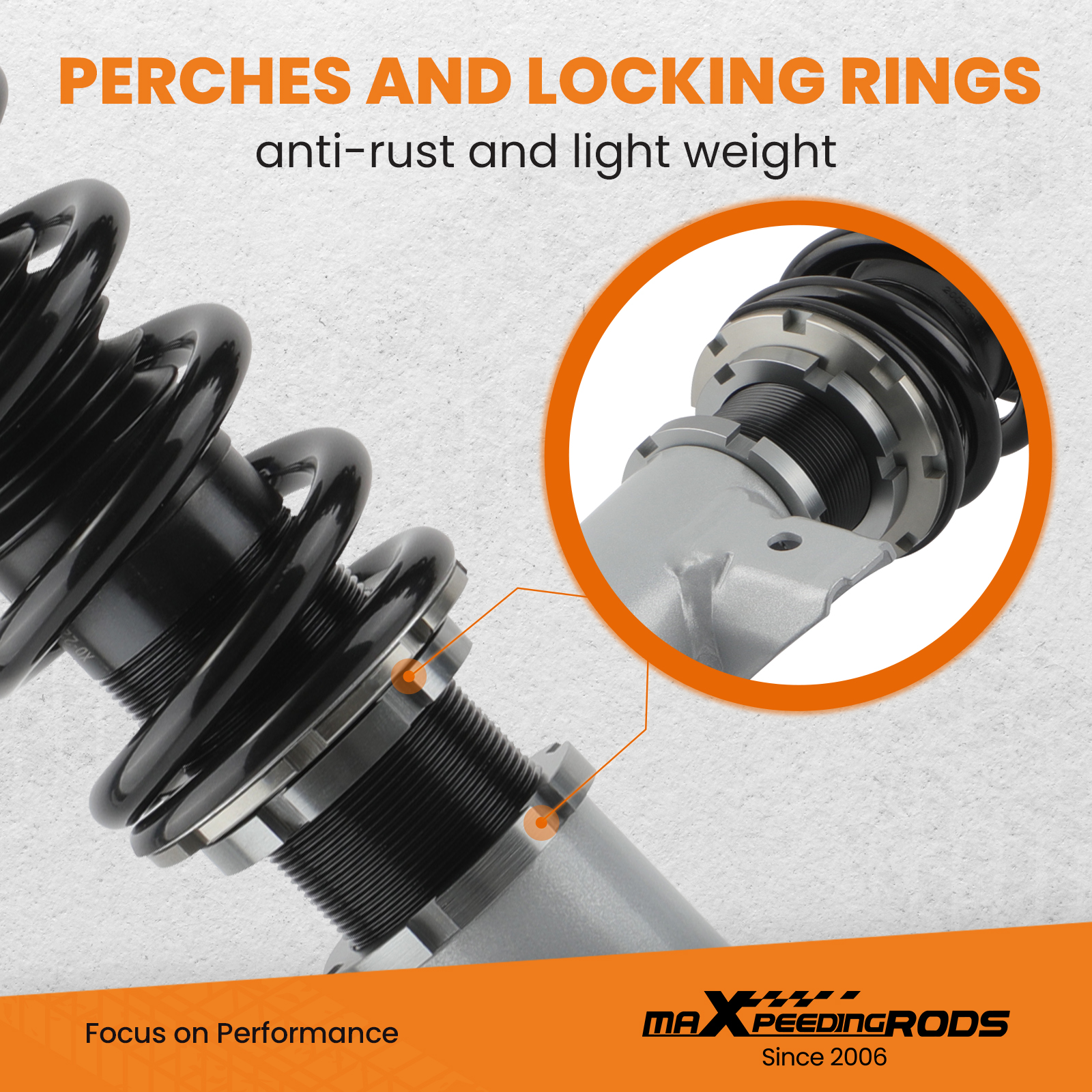 - Most pieces in our Coilover systems, including mounts, collars and spring perches, are designed from 6061-T6 Billet Aluminum resulting in lightweight, durable and rust resistant components.