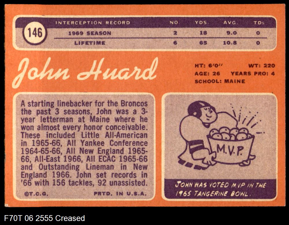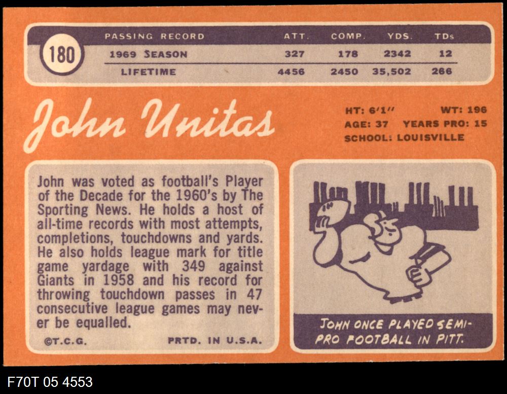 This 1970 Topps Football Complete Set includes 263 cards. Card fronts have an oval photo of the player surrounded by a tan border. The player's name and team is located within a banner at the bottom. At the bottom right of the card is a football images that contains the player's position.