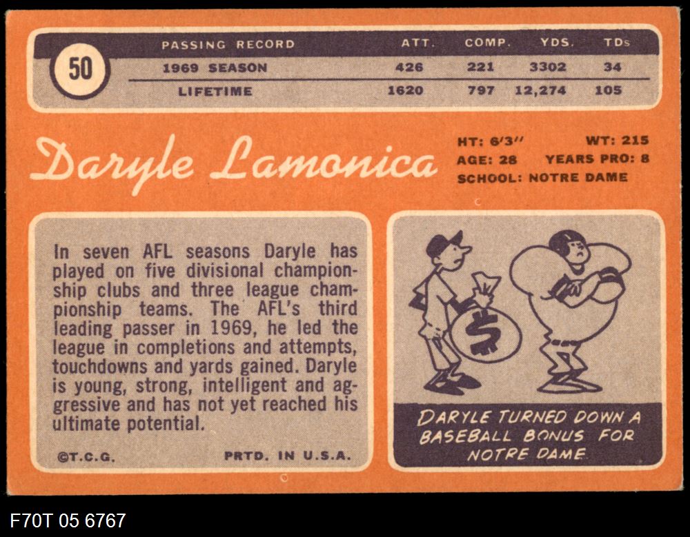 | 1970 Topps #50 Daryle Lamonica | 4.5 - VG/EX+ | Front | Back |