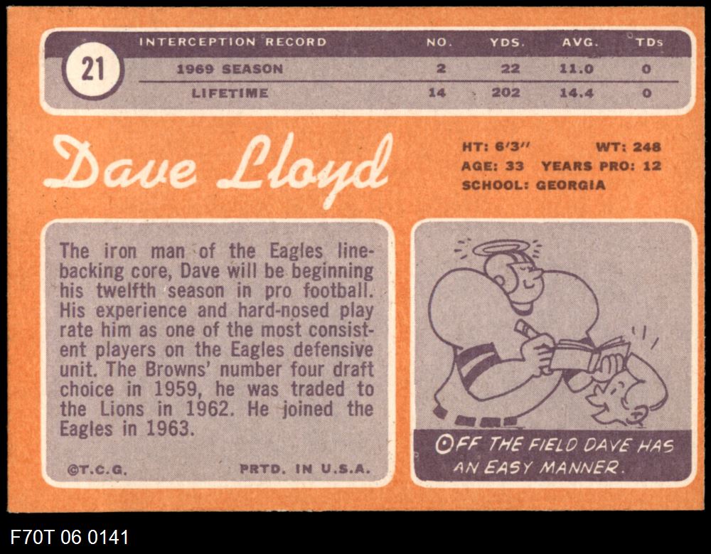 | 1970 Topps #21 Dave Lloyd | 6 - EX/MT | Front | Back |