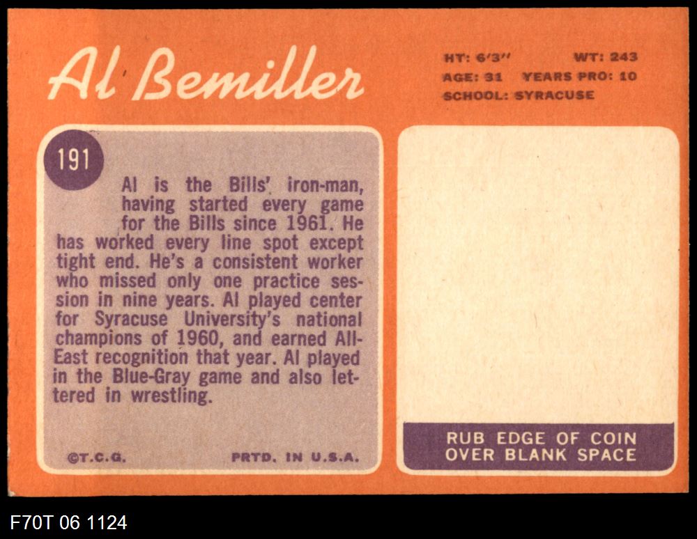 | 1970 Topps #191 Al Bemiller | 5 - EX | Front | Back |