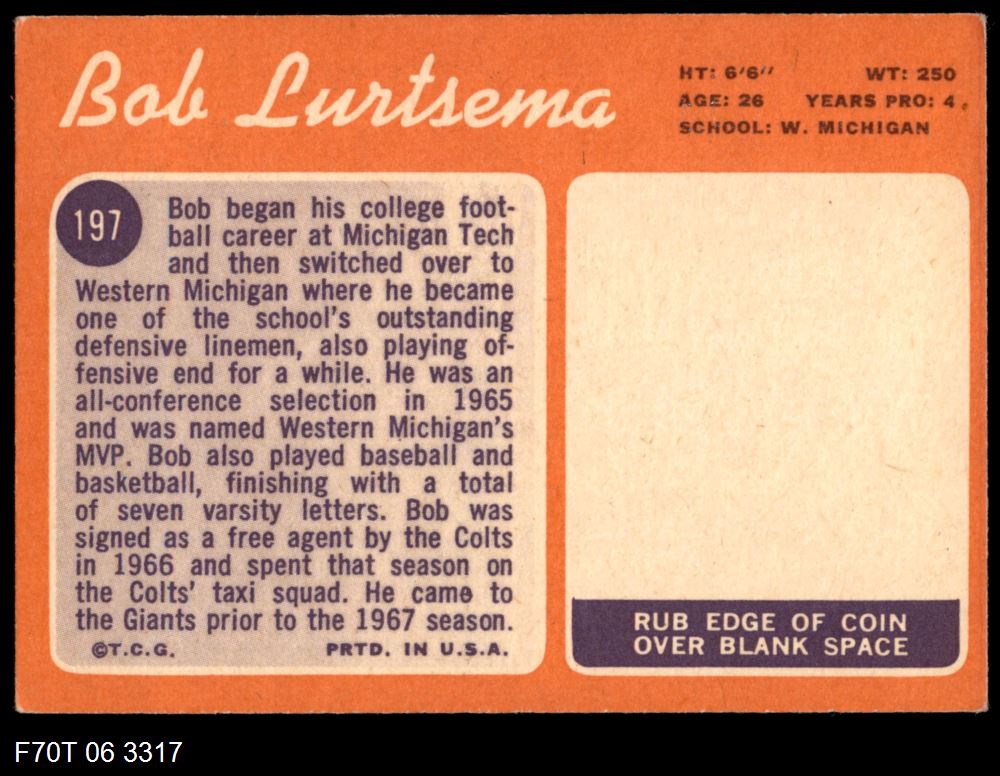 | 1970 Topps #197 Bob Lurtsema | 5 - EX | Front | Back |