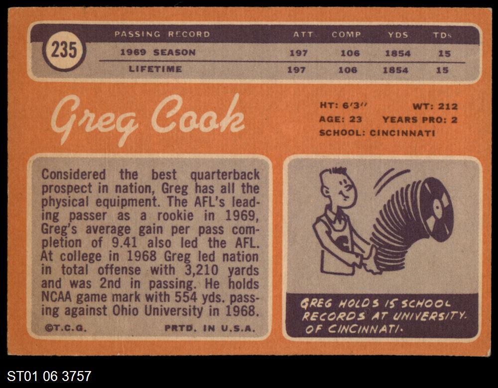 | 1970 Topps #235 Greg Cook | 4 - VG/EX | Front | Back |
