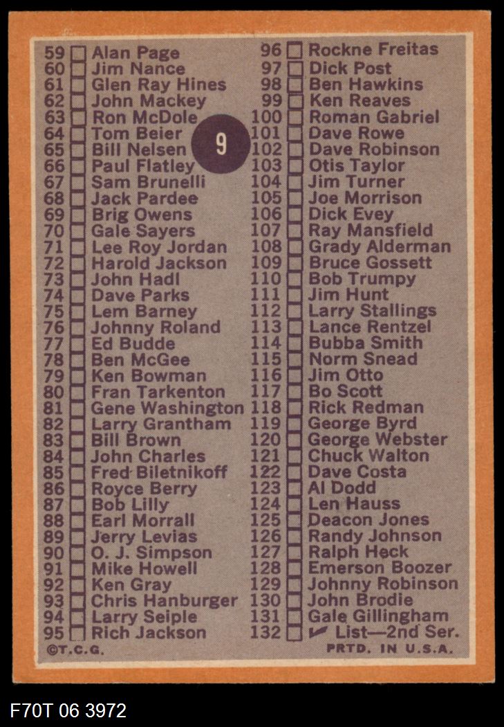This 1970 Topps Football Complete Set includes many note worthy rookie cards including: ?O.J. Simpson, Bubba Smith, Calvin Hill, both Gene Washingtons, Alan Page, Lem Barney, Larry Brown, Bill Bergey, Mike Garnett, Fred Dryer, Harold Jackson, Tom Mack, Jan Stenerud, and Bob Trumpy.