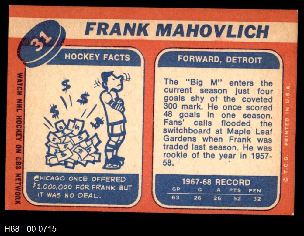 | 1968 Topps #31 Frank Mahovlich | 4 - VG/EX | Front | Back |