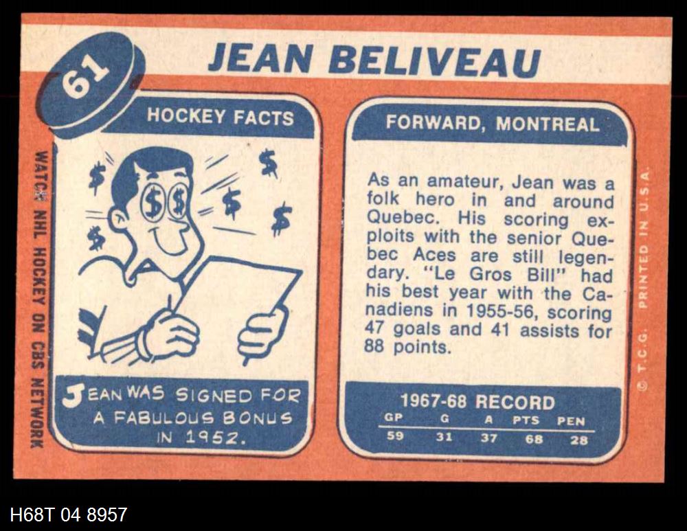 | 1968 Topps #61 Jean Beliveau | 5 - EX | Front | Back |