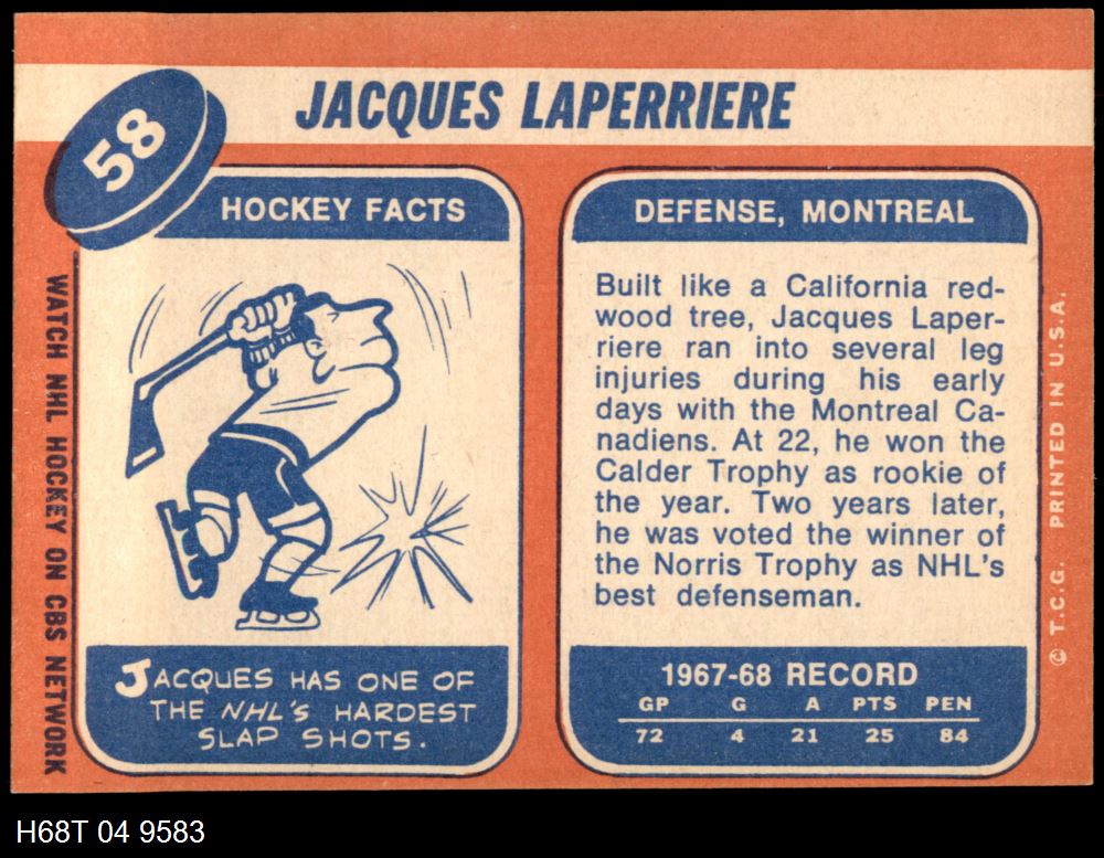 | 1968 Topps #58 Jacques Laperriere | 6 - EX/MT | Front | Back |