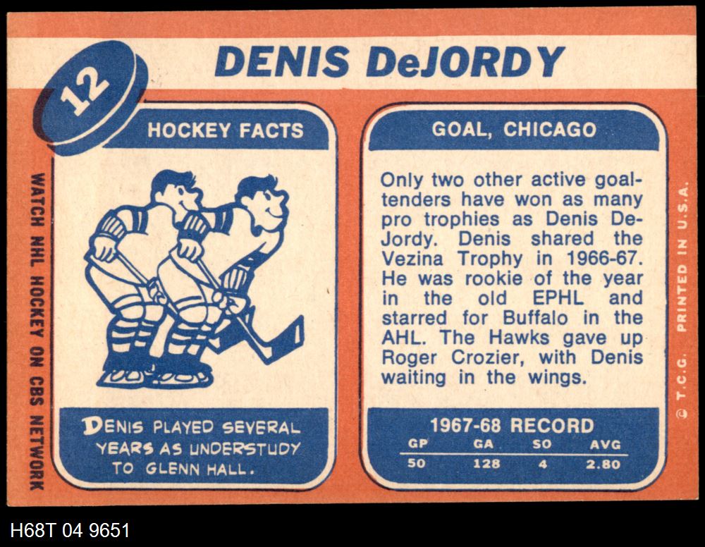 | 1968 Topps #12 Denis DeJordy | 7 - NM | Front | Back |