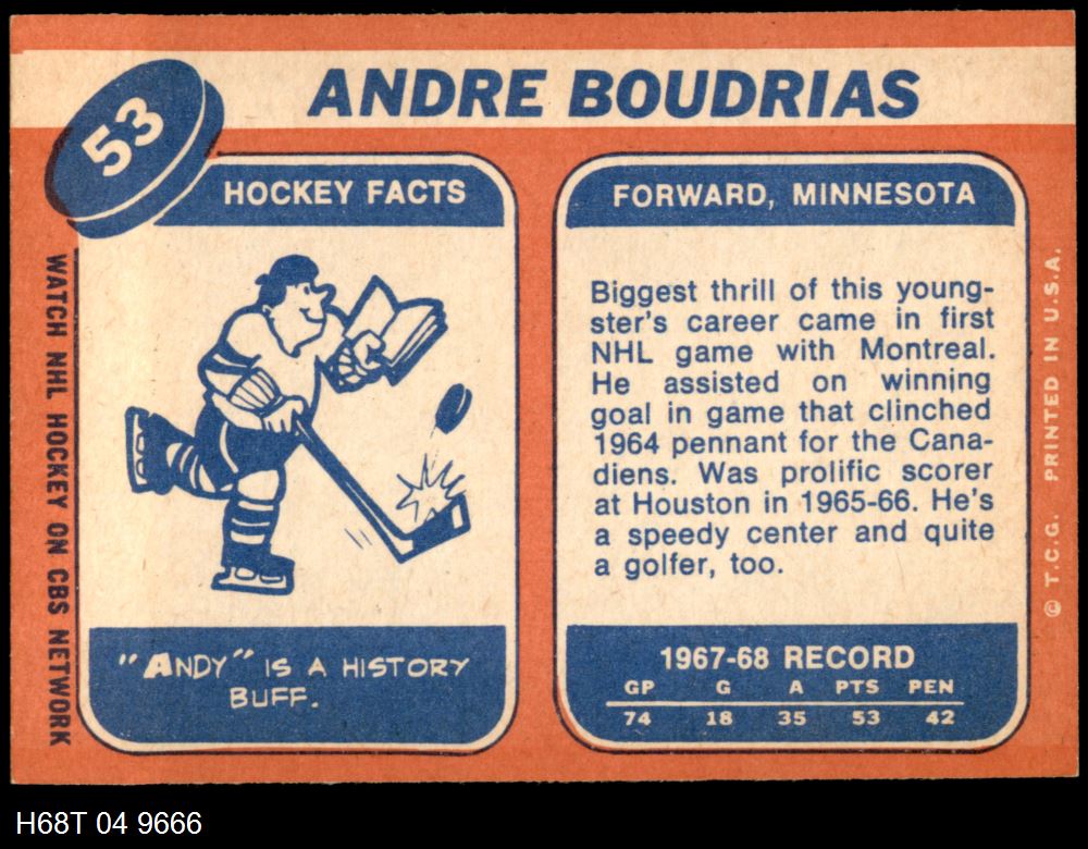 | 1968 Topps #53 Andre Boudrias | 6 - EX/MT | Front | Back |