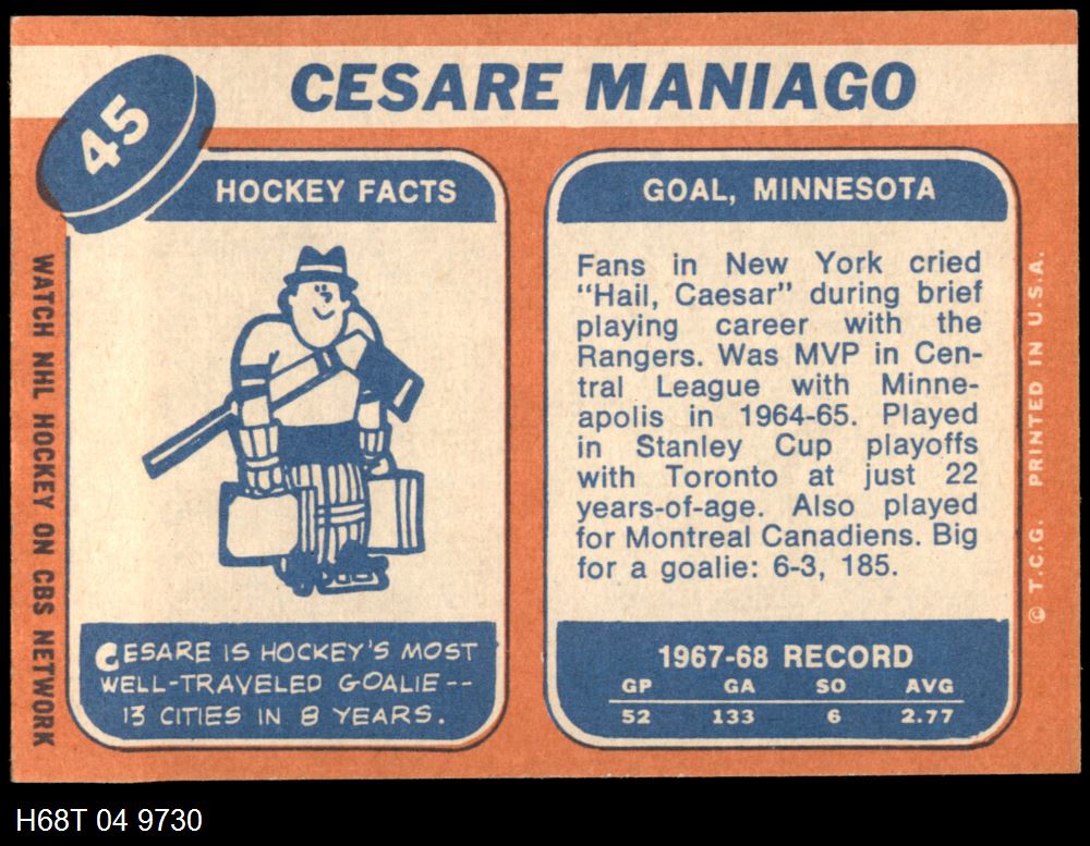 | 1968 Topps #45 Cesare Maniago | 5.5 - EX+ | Front | Back |