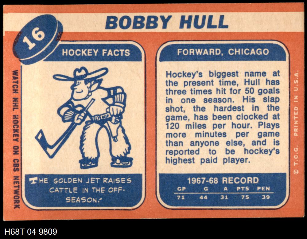 | 1968 Topps #16 Bobby Hull | 6 - EX/MT | Front | Back |