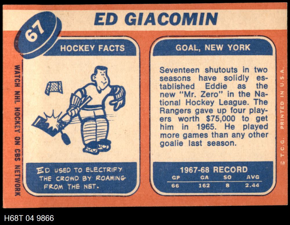 | 1968 Topps #67 Ed Giacomin | 6 - EX/MT | Front | Back |