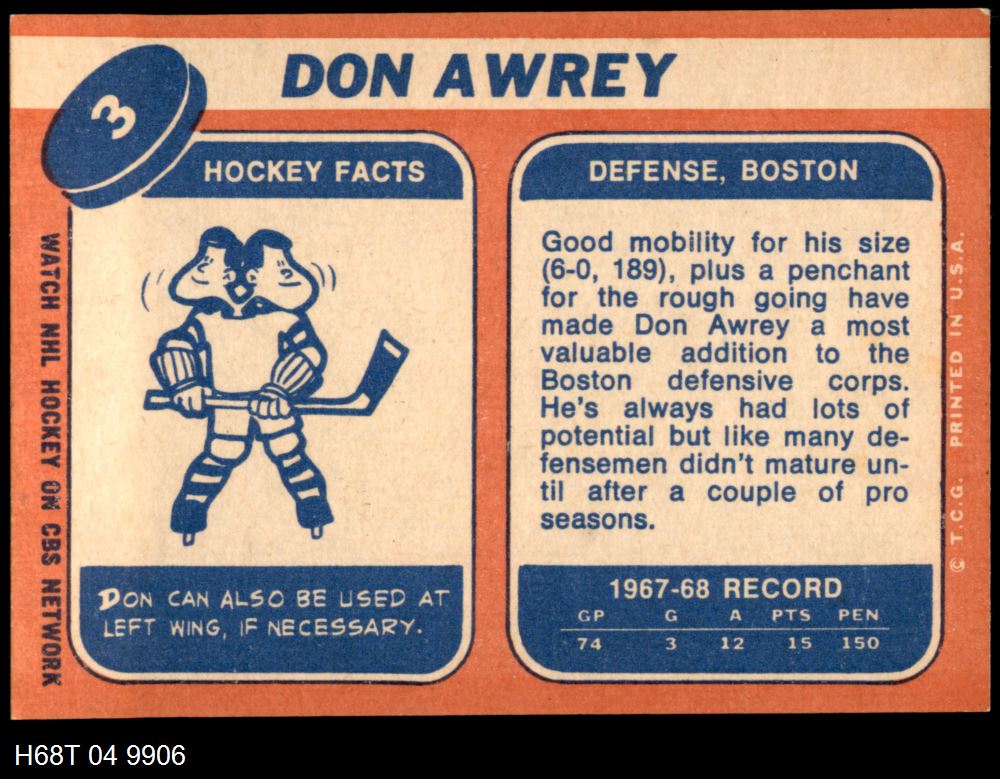 | 1968 Topps #3 Photo is of #43 Skip Krake Don Awrey | 5 - EX | Front | Back |