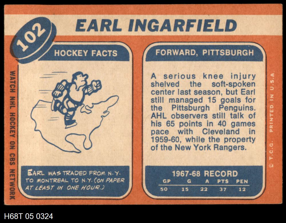 | 1968 Topps #102 Earl Ingarfield | 5 - EX | Front | Back |
