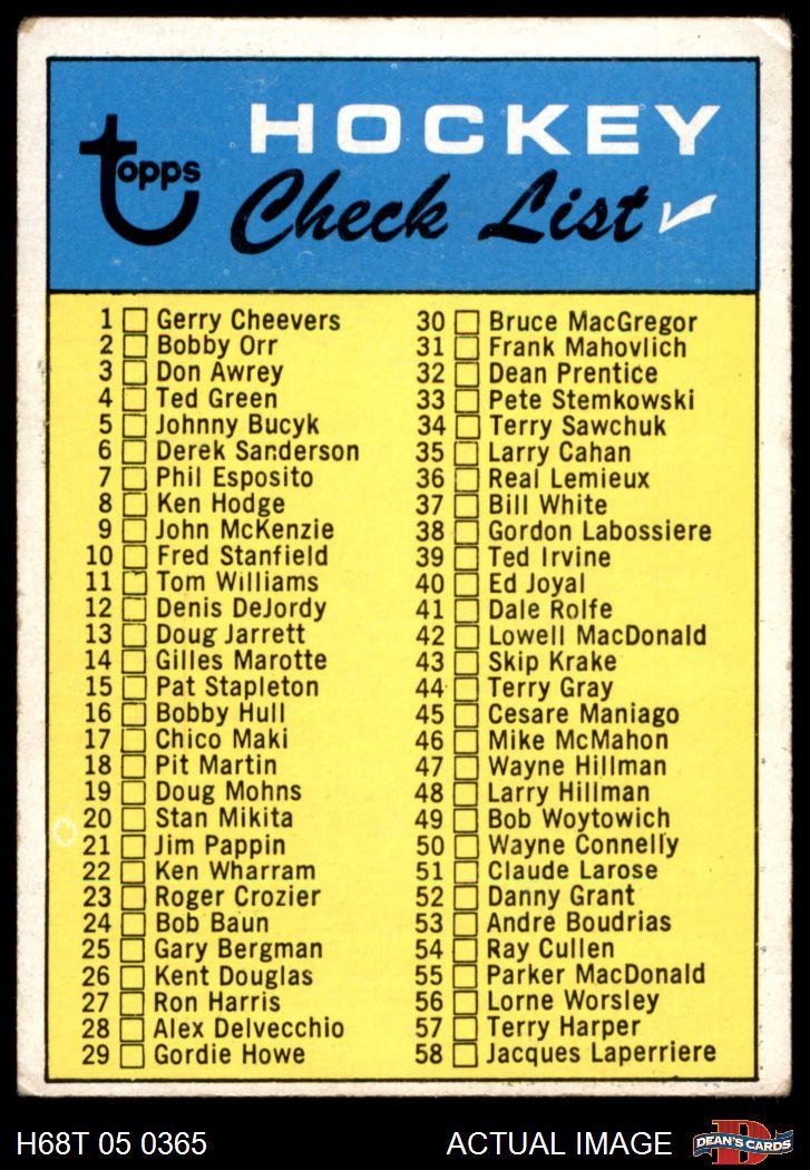 This 1968-69 Topps Hockey Card Near Complete Set contains the majority of the?132 cards. Please see below for the exact cards in the set and their front and back scans.??With a unique horizontal design, the cards are grouped by teams, in alphabetical order, by city name.?The key?1968-69 Topps?rookie is #89 Bernie Parent.