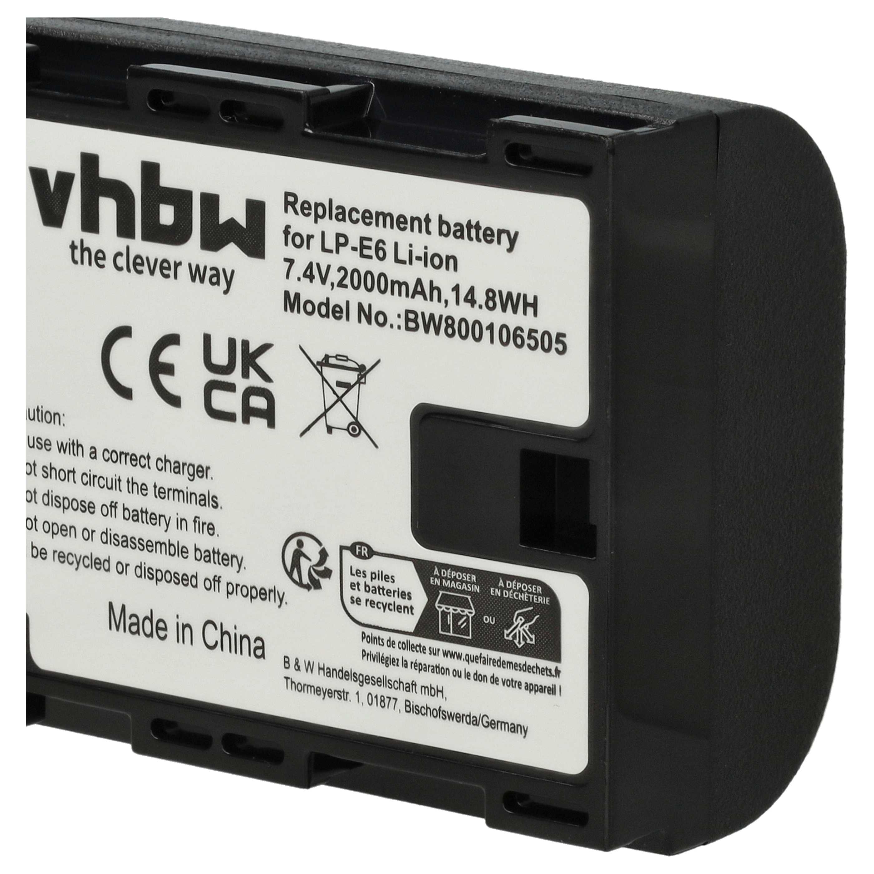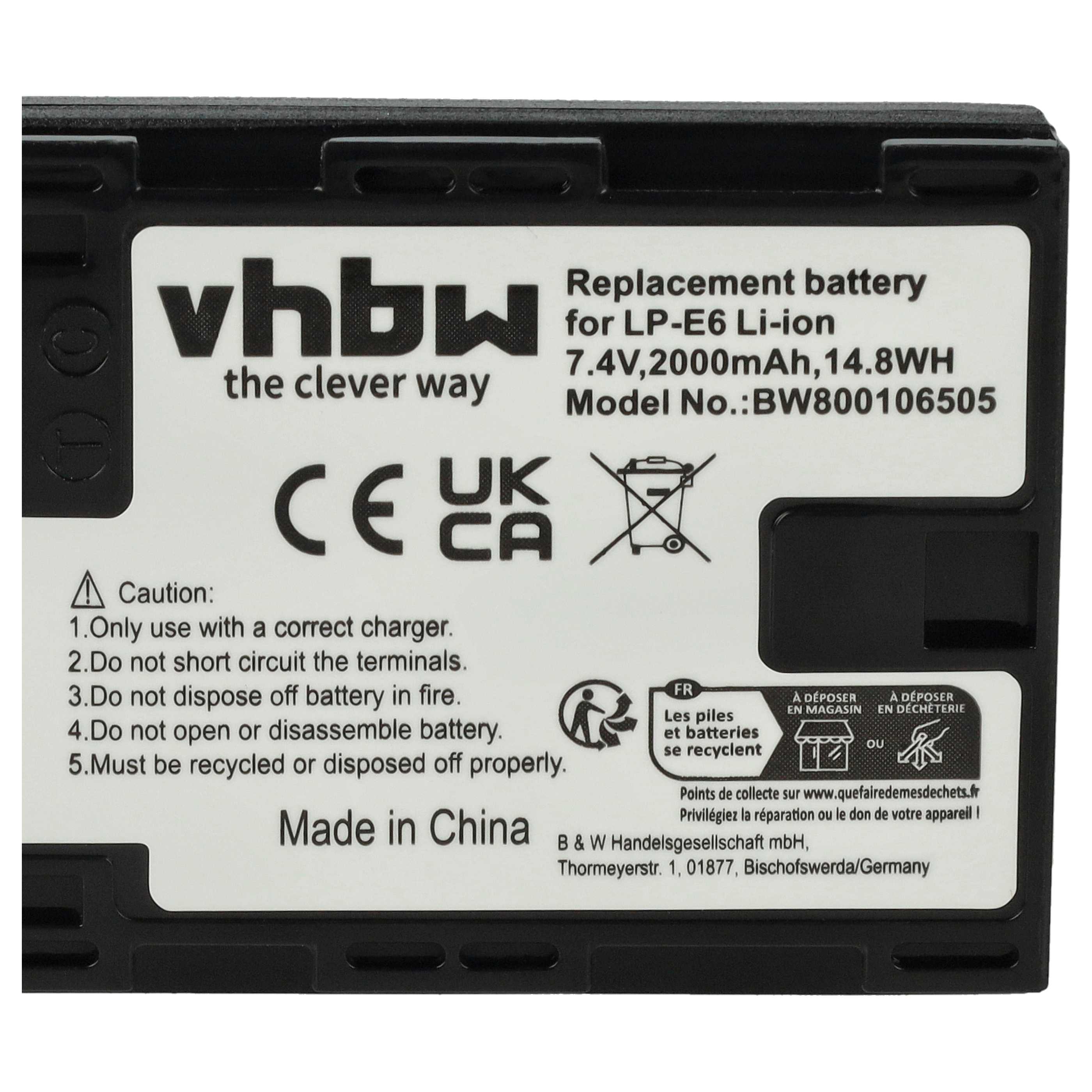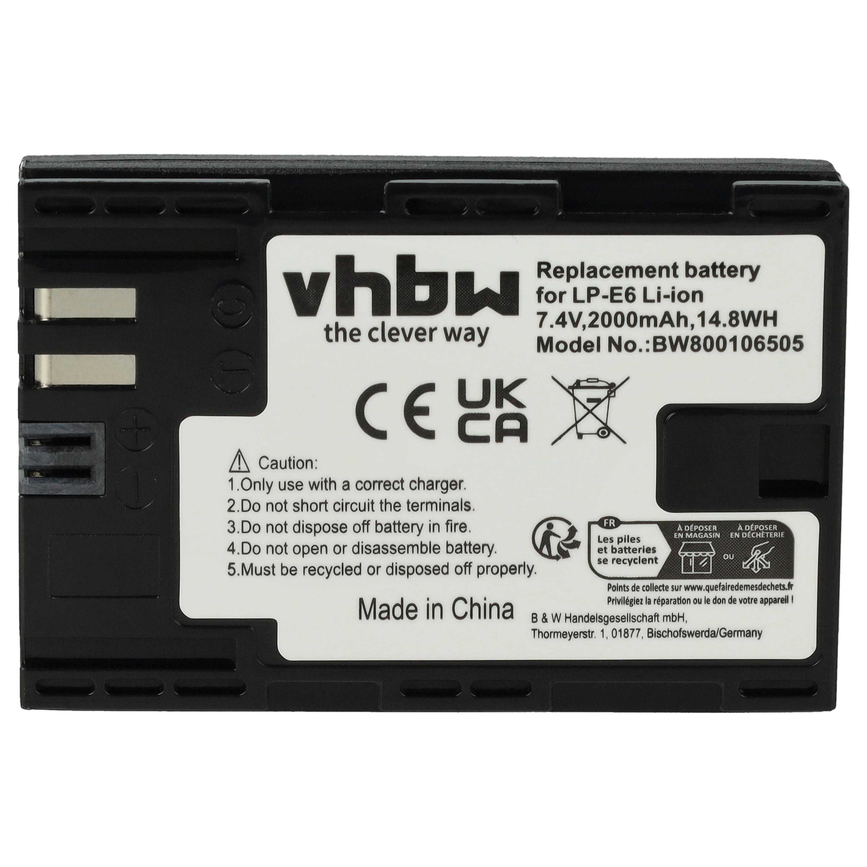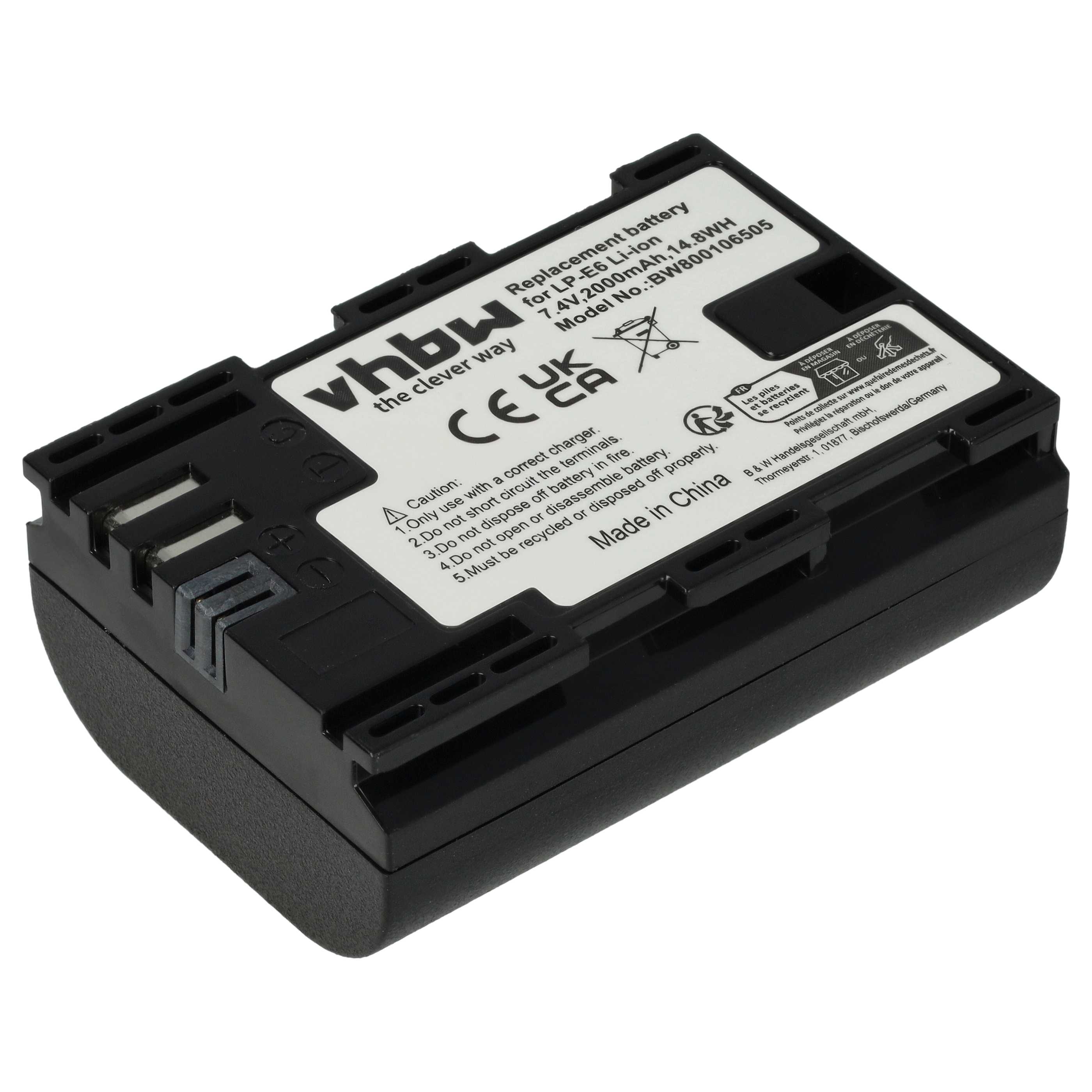 vhbw Batterie rechargeable pour Canon EOS R6 Mark II, 90D, R, R5 Mark II, 80D, R5 C, R5, R6 appareil photo, appareil numérique (Li-ion; 2000mAh; 7,2V)