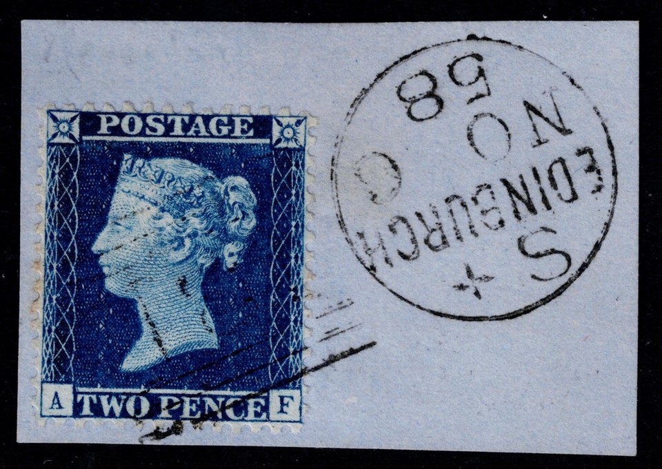 A superb used 2d Blue SG 35 from plate 5, lettered AF, tied to a Scottish piece by a fine, crisp EDINBURGH '131' duplex 'NO 6/58'. STATE TWO. RE-ENTRY. Spec. F7g Cat. £200.00