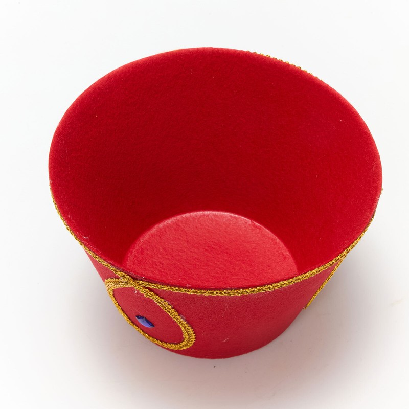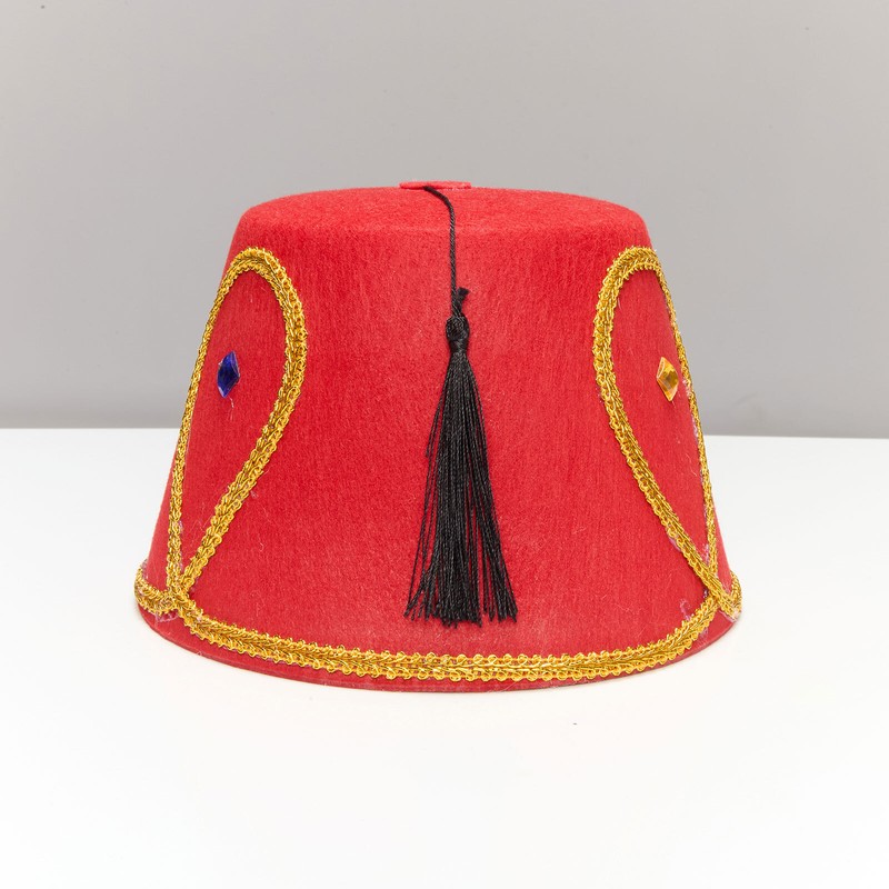The hat decorates with black tassel on the top, gold lace trim and big gem, creating an exotic and luxurious appearance for the clothes.