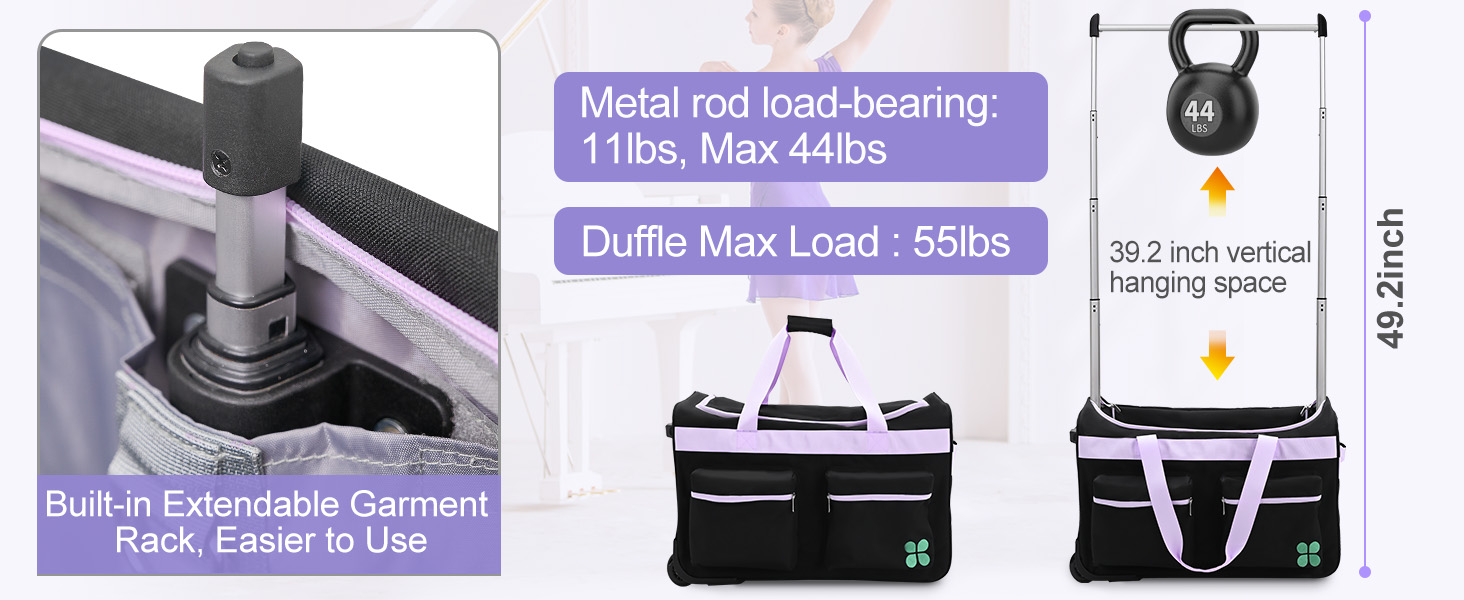 Portable Garment Rack: Can serve as an easy to carry and set up portable garment rack that holds up to 44.09 lbs, everything you need for competition, a major show, or your world tour. It expands to nearly 5 feet tall and is made with steel parts with the double-locking mechanism. Holds all her clothing without sliding or collapsing. Bag is fully collapsible when empty to just 5.5".